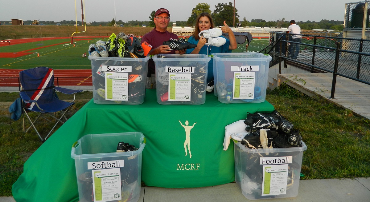 Oskaloosa, Iowa – Kevin Peterson, Oskaloosa High School Athletic Director and Sherry Vavra, Director of Mahaska Community Recreation Foundation (MCRF), were flooded with donations toward the Play It Forward athletic equipment exchange program at the Old Shoe Game. Play It Forward, sponsored by MCRF, is a aimed at promoting more youth involvement in recreation activities.