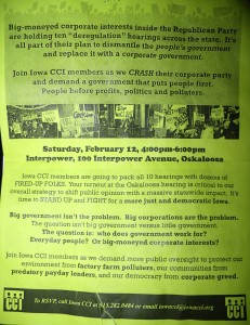 Several different political action groups were on hand to have their voices heard. National People’s Action and Iowa Citizens for Community Improvement, which itself, had sent fliers out asking for people to RSVP and join them in “CRASHING” the meeting that day.