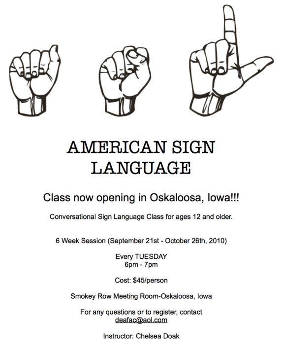 Sign Language Class Starting in Oskaloosa at Smokey Row meeting room each Tuesday from 6 to 7 pm until October 26, 2010