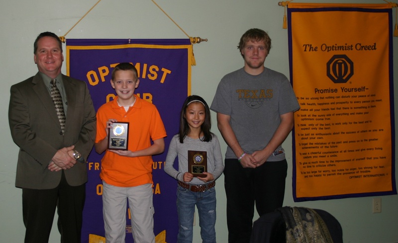 Optimist Club President Jeff Keep and project chairman Andy Hotek made the presentation of plaques to the students. The awards were made at the club’s regular meeting at Smokey Row Wednesday morning.