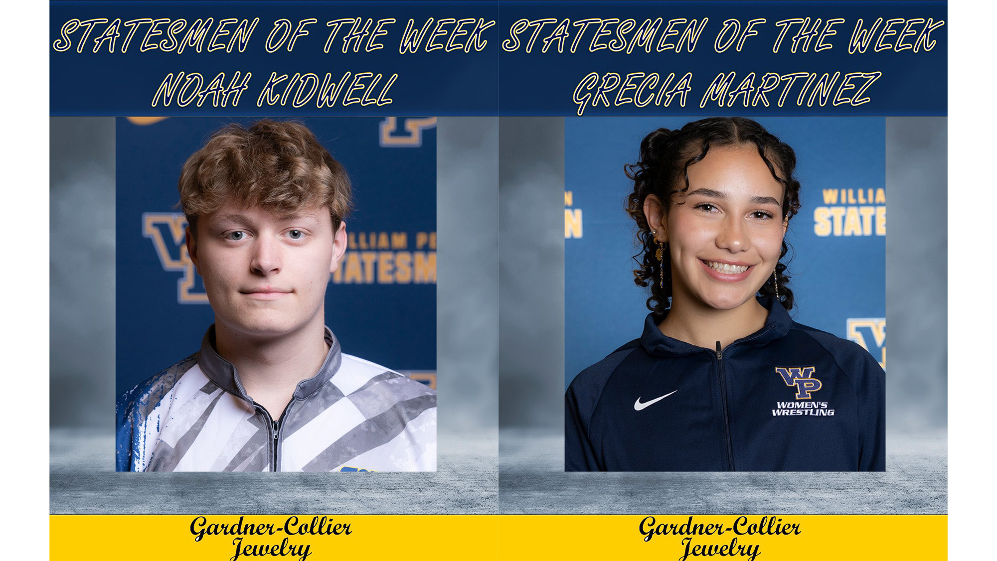 Men's bowler Noah Kidwell (Fr., Bettendorf, Iowa, Mechanical Engineering) and women's wrestler Grecia Martinez (So., Horizon City, Texas, Engineering) have been named the Statesmen of the Week for the week of November 6-12, presented by Gardner-Collier Jewelry.