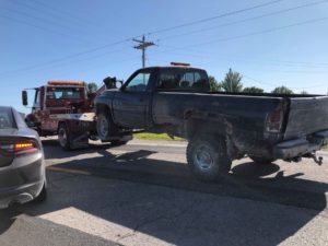 The suspected stolen vehicle is prepared to be towed away from the scene on Wednesday afternoon. (photo by Candace Flattery/Oskaloosa News)