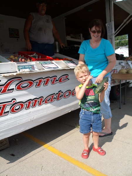Sawyer (front) and Renee VanDee of Deep River makes a stop by Greg Grubbs produce stand along A Ave West