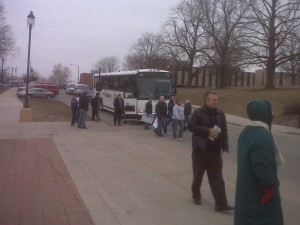 Union members buses arrive at the foot of the Iowa Capitol for Tuesdays rally in Des Moines (photo courtesy Reg Randau)