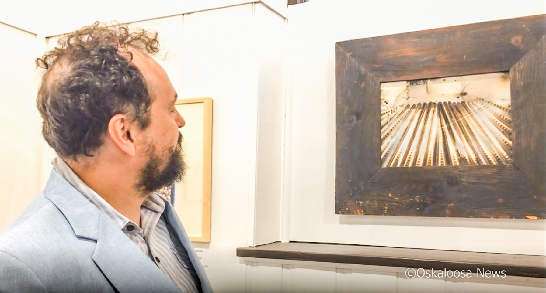 Brant Bollman takes in the many different art pieces at the opening of Visible/Invisible show opening at the Oskaloosa Art Center.
