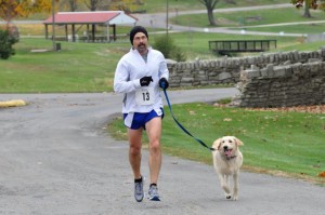 Keith Comfort and Molly cross the line first in the 5k portion of Stephen Memorial’s First Annual K-9 5K and Dog Walk.