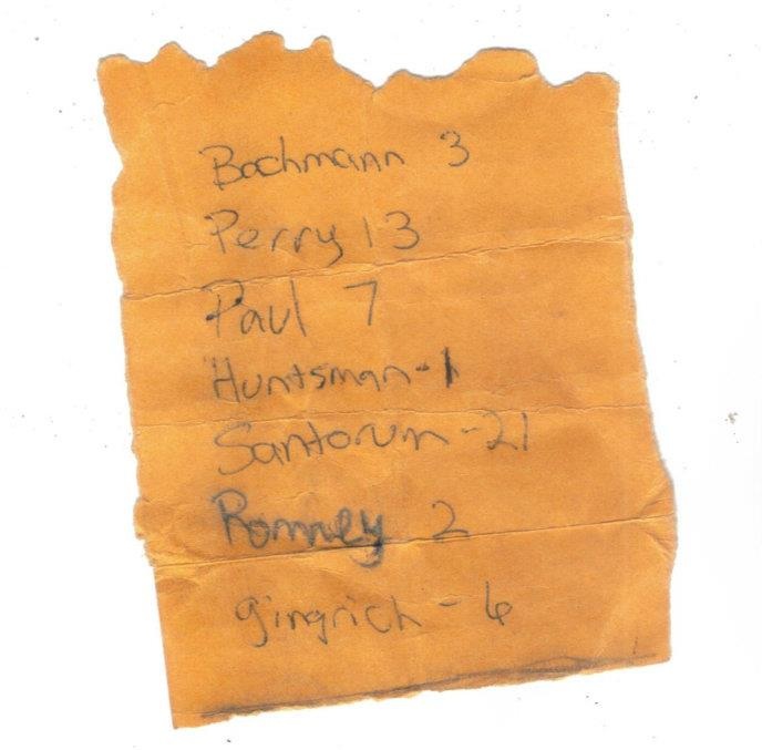 There True was asked to help count the ballots, where the totals ended up being 3 for Bachmann, 13 for Perry, 7 for Paul, 1 for Huntsman, 21 for Rick Santorum, 2 for Mitt Romney, and 6 for Newt Gingrich.