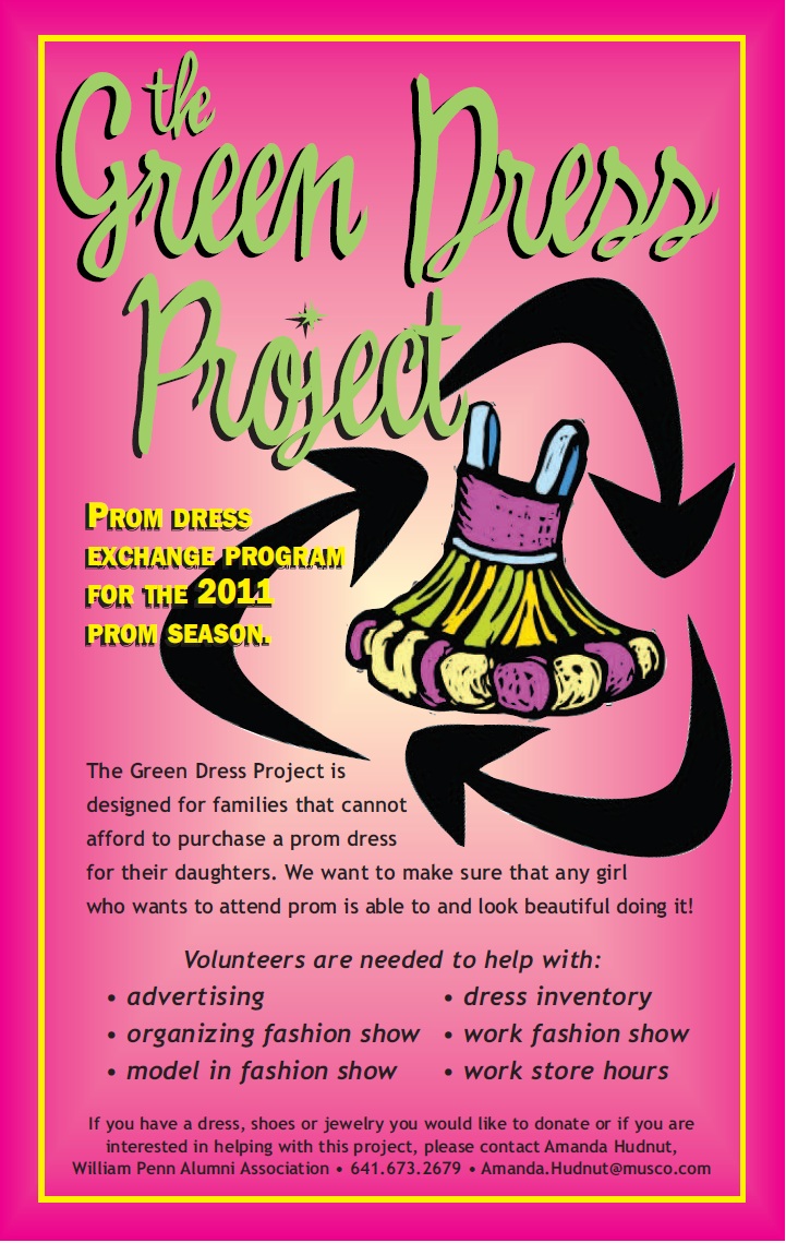 Amanda Hudnut also explained to us in an e-mail the history of the green dress project. “This project was started a few years back by the Oasis school (Oskaloosa’s Alternative High School). In 2009, the Oasis school contacted the William Penn University Alumni Association and due to budget cuts, they would not be able to continue the project and wanted to know if we would be interested in taking over. Of course, we jumped at the chance.” Hudnut said that 96 dresses were sold last year. “The William Penn University Alumni Association would like to continue this and make it bigger and better!” Hudnut said.