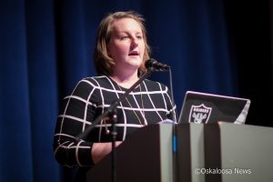 Amy Meyer speaks to a gathered crowd about what it would take to start a youth mentoring program in Mahaska County.