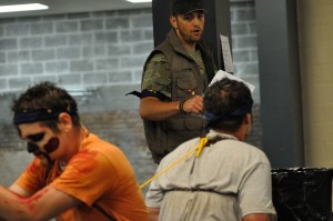 Josh Shutting (back) is seen here with two captured “zombies” Wednesday as he helped to inform players of the rules and game play.